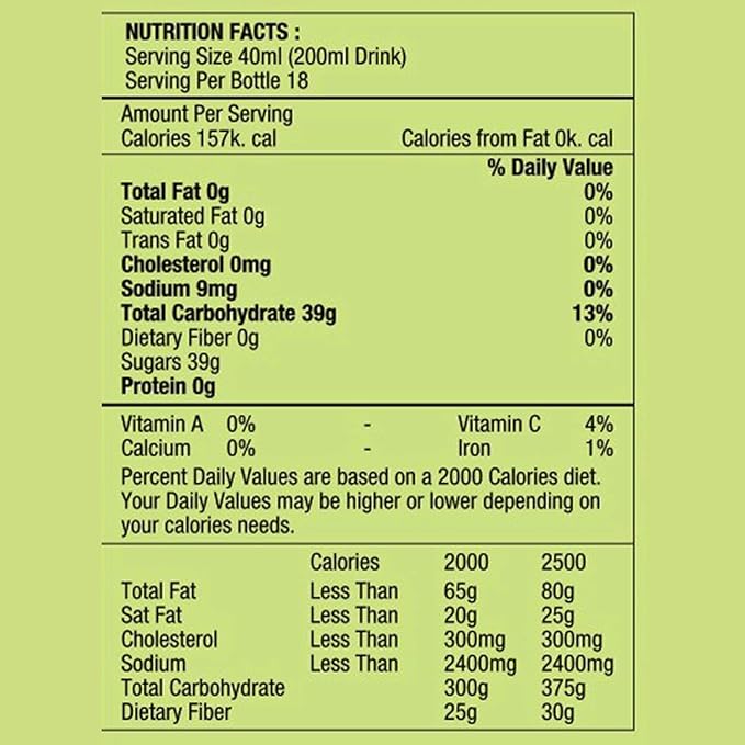 - INGREDIENTS: Sugar, Water, Extract of Khus, Citric Acid, Class II preservative (INS-211), Synthetic Food Colour (INS-143), Nature identical flavoring substances.