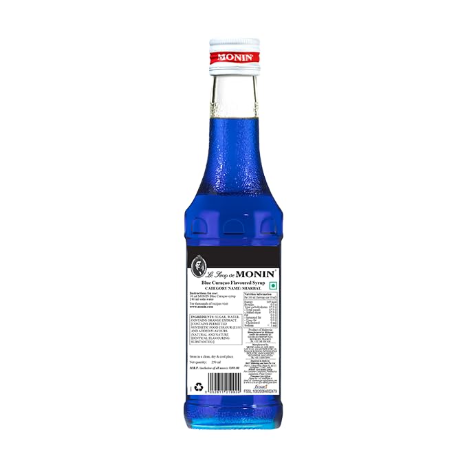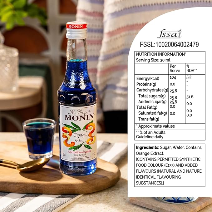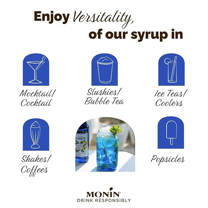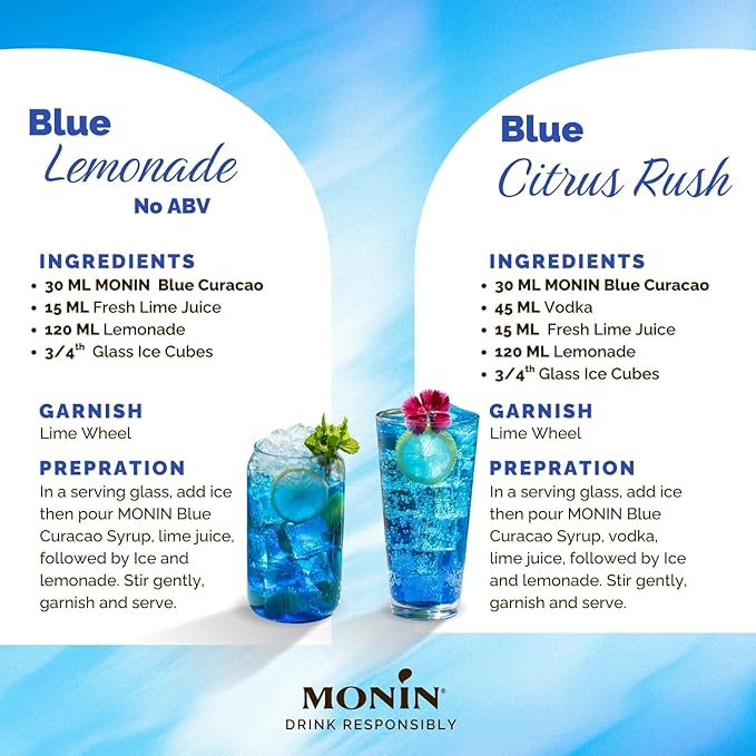 - Iconic Blue Curacao Syrup – Vibrant Color & Bold Citrus Taste – Monin’s blue curacao syrup delivers a tropical burst of tangy orange flavour and a striking blue hue that instantly elevates your cocktails, mocktails, and desserts.