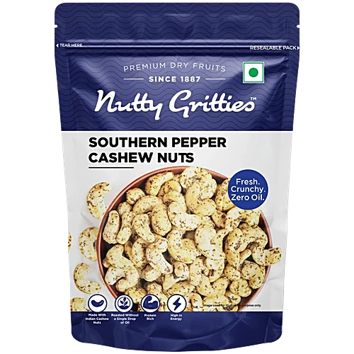 Indulge in the delightful flavours of Nutty Gritties’ Southern Pepper Cashew Nuts, a guilt-free snacking experience that caters to your healthy lifestyle. Crafted with precision and passion, these cashews are roasted to perfection without a single drop of oil, making them an excellent choice for wholesome snacking. Infused with the bold and aromatic spices of Southern India, these cashews deliver a symphony of flavours that will tantalize your taste buds. Packed with good fats and high in fibre, they are perfect for weight management and satisfying hunger pangs. Whether you’re craving a nutritious treat, a party snack, or a delicious on-the-go option for your kids, Nutty Gritties’ Southern Pepper Cashew Nuts are the answer. Indulge in the culinary magic of this vegan-friendly, keto-friendly, and gluten-free delight, and experience the true essence of Southern Indian flavours with every bite.