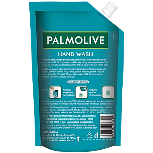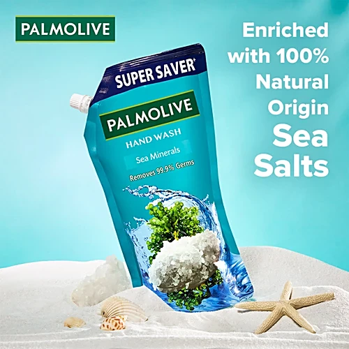 Deep cleansing hand wash with naturally derived sea minerals. Cleanses hands thoroughly to leave them feeling fresh and soft. Contains an anti-germ agent that removes 99.9% of germs. Provides long-lasting protection and freshness. Also, try the exotic Black Orchid & Milk Enriched Palmolive Handwash Refill pack. Palmolive Naturals Hand Wash with the natural goodness of sea minerals deep cleanses your hands every time you wash them. Containing sea salt of 100% natural origin, the hand wash is effective yet gentle on your hands. It also contains an anti-germ agent that removes 99.9% of germs and provides long-lasting protection. The special formula pampers your hands with every wash and delights your senses with its unique fragrance.