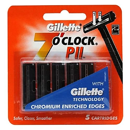 Gillette 7 O’ Clock PII-6 Twin Blade Cartridges cut the hair effortlessly for an extremely relaxed shave. With a unique cartridge design for trouble-free cleaning and Chromium enriched edges for softer, more relaxed shaves.