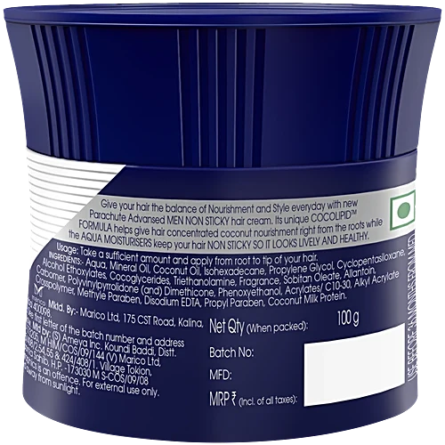 Parachute Advansed after shower classic hair styling cream for men provides a perfect balance of nourishment and style with its unique, natural cocolipid formula that gives hair concentrated coconut nourishment right from the roots. Enriched with coconut milk proteins, mineral oil and coconut oil, this non-sticky, moisturising cream keeps hair soft, smooth and shiny for a confident, lively look every day. The coconut oil extract nourishes hair and adds a beautiful shine, while the aqua moisturisers help to prevent stickiness. Suitable for everyday use, this classic hair cream protects men’s hair from the extremities of their lifestyle, leaving it healthy and vibrant.