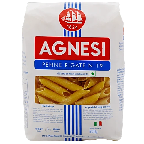 Agnesi Penne Rigate N.19 is a durum wheat semolina pasta. It undergoes a special drying process to achieve the perfect al dente texture. This classic Italian pasta is ideal for a variety of pasta dishes and can be enjoyed with your favourite sauces.
