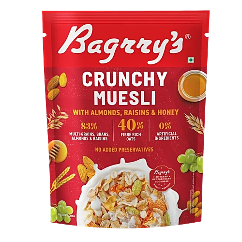 Indulge in the wholesome and crunchy delight of Bagrry’s Crunchy Muesli, a premium breakfast experience crafted with the finest ingredients from around the world. Inspired by the original Swiss muesli recipe, this multigrain cereal is a true feast for the senses. Savour the rich flavour and satisfying texture of imported whole oats, succulent sultana raisins, and natural honey, all blended together to create a high-fibre, protein-packed start to your day. Unlike other mueslis, this Swiss-style cereal boasts more than 30% no added sugar, featuring a delightful medley of fruits, nuts, and berries that make mornings as indulgent as they are nourishing. Naturally free from artificial flavours, colours, and preservatives, Bagrry’s Crunchy Muesli is a wholesome and crunchy delight that will leave you feeling energised and satisfied, the perfect way to kickstart your morning.