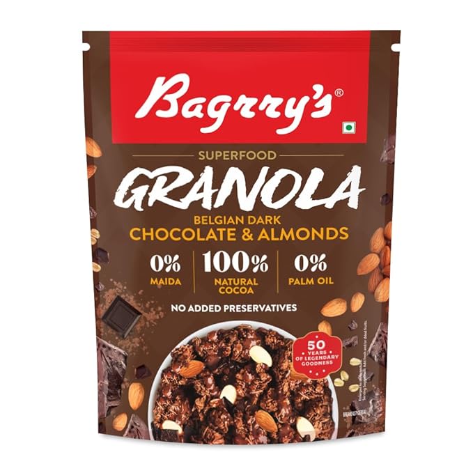 • Bagrry’s Granola Superfood Belgian Dark Chocolate & Almonds is a delicious and wholesome mix crafted from nutritious ingredients like fibre-rich oats, protein-packed quinoa, whole rice, wheat bran, crunchy almonds, and premium Belgian dark chocolate made with 100% natural cocoa.