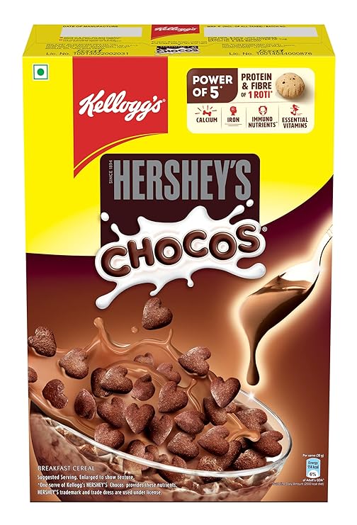 - +One serve (30g) of Kellogg’s HERSHEY’S Chocos gives the Power of 5 by providing Protein & Fibre of 1 roti*, Calcium, Iron, Immuno nutrients** and Essential Vitamins.