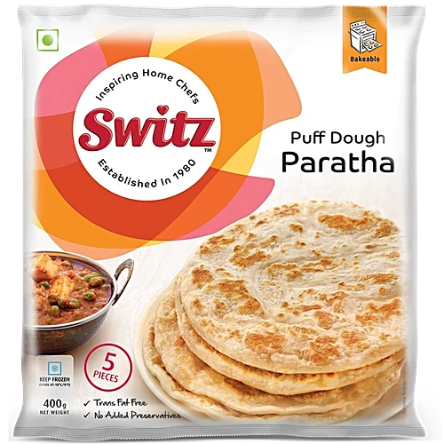 Switz Puff Parathas are made with the highest quality ingredients through a specialised layering process that makes them fluffy and flaky. Made of wheat, these scrumptious parathas melt in the mouth and will instantly become your new favourite. The buttery soft parathas can easily be folded or cut into pieces and taste delicious with curries or just with tea. If you like laccha paratha or Malabar paratha, you will love the Switz Puff Paratha. It also serves as a versatile base for many snacks and dishes that can easily be made on a non-stick pan, like mini rolls, quesadilla, Kathi rolls, paratha wraps, etc. You can even use it as a puff pastry by baking to make tarts, aloo/veg/kheema puffs, cheese burst pizza, chicken pie, caramelized onions, or mushroom mini bites, pinwheel bites, paratha twists, etc. With the Switz Puff Paratha, the only constraint is your imagination and creativity.