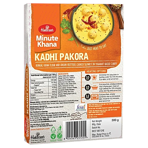 Haldiram’s Ready to Eat brings to you Kadhi Pakora that is made of fresh high-quality ingredients. We give you a traditional kadhi pakoda that makes your cooking easy. It is an exotic North Indian dish of onion fritters dunked in a spiced yoghurt sauce. Now enjoy this delicious kadhi at home with just a few steps. It is 100% natural, without any preservatives, addictive’s, flavouring or colours.