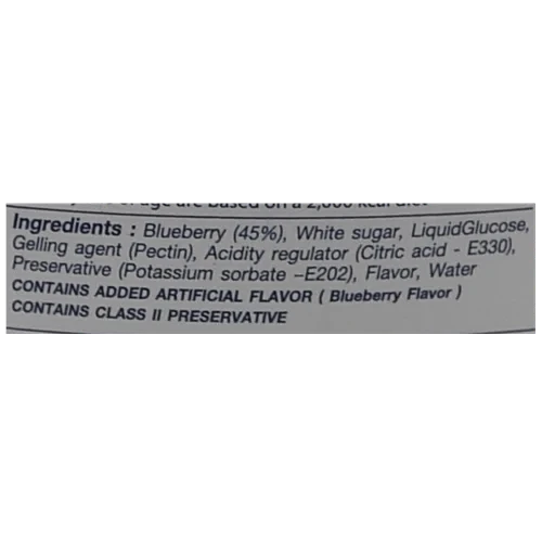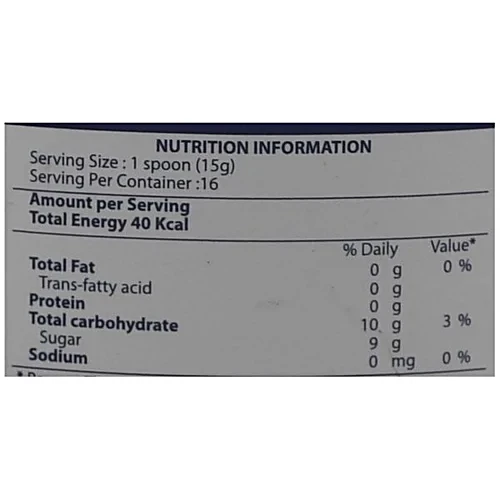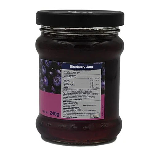Chabba blueberry fruit jam is prepared by using only fresh and natural, high-quality blueberries. The jam contains blueberries, sugar, glucose syrup and citric acid in varying proportions and comes hygienically packed in a glass bottle of 240 grams. You can spread this smooth jam on breads to relish its taste unadulterated or add it to baked goods for an added layer of sweetness.