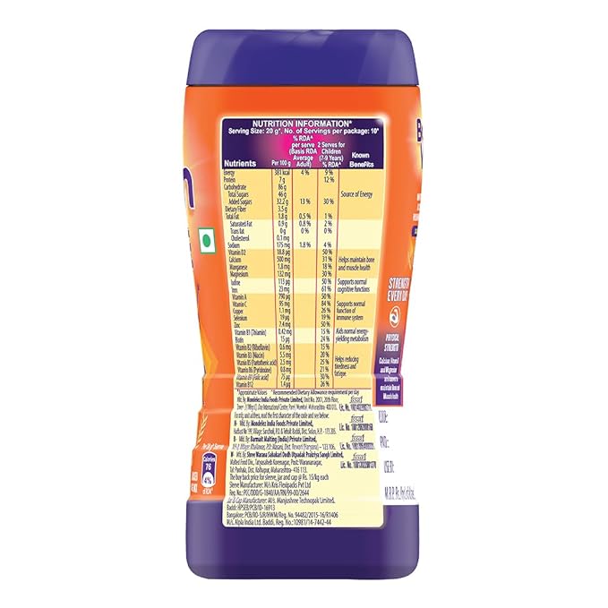 • Strength Every Day+ Bournvita is a scientifically designed formula, crafted by nutritionists with a bundle of nutrients that are known to support Physical strength (Calcium, Vitamin D and Magnesium are known to maintain Bone and Muscle health); Mental Strength (Iron, lodine and Zinc which help in normal cognitive functions); Immune strength (Vitamin C, Vitamin D, Zinc and Iron to support the immune functions). Thus, supporting strength and providing high energy.