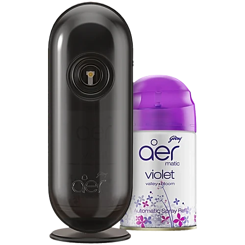 Godrej Aer Matic is a range of automatic air freshener diffusers available in four fragrances. This air freshener for a room with a flexi-control timer sprays every 10, 20, or 40 minutes, allowing you to control fragrance intensity. The air freshener automatic spray is sure to adorn your interior spaces and works perfectly, be it your living room, bedroom, or office spaces. The automatic room freshener can easily be wall-mounted with the provided mounting hole at the back or placed on a shelf with the inbuilt stand. Our battery-operated room freshener keeps your space fragrant 24×7 without any hassle. Each refill pack guarantees 2200 sprays and lasts up to 60 days (under low settings). At the end of its cycle, just replace the air freshener refill with any of our four fragrances – Violet Valley Bloom, Fresh Lush Green, Petal Crush Pink, and Cool Surf Blue.